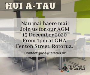 E te tii, e te taa o Te Arawa whānui, nau mai piki mai kake mai ki te hui a-tau a Te Tatau o Te Arawa. E haere ake te hui nei a te 13 o Hakihea ki te tari o GHA i te tiriti o Fenton. Mō te roanga o ngā whakamārama whakapā atu ki tā mātau mana hautū, Jude Pani, i runga īmera – jude@tetatau.nz.